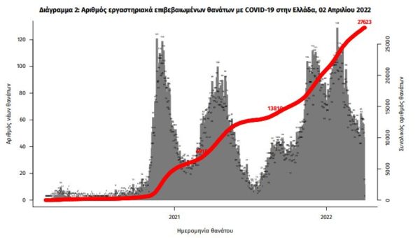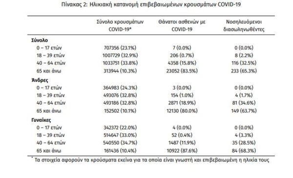 Οι νέοι θάνατοι ασθενών με COVID-19 είναι 52, ενώ από την έναρξη της επιδημίας έχουν καταγραφεί συνολικά 27.623 θάνατοι. Το 95.3% είχε υποκείμενο νόσημα ή/και ηλικία 70 ετών και άνω.
