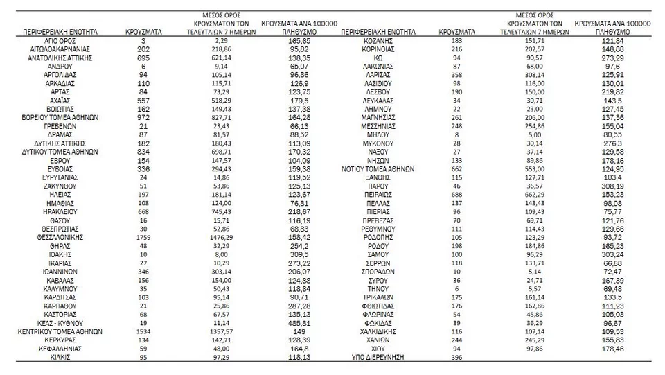 Ακολουθεί ο πίνακας με την κατανομή των 15.786 νέων εγχώριων κρουσμάτων ανά Περιφερειακή Ενότητα: