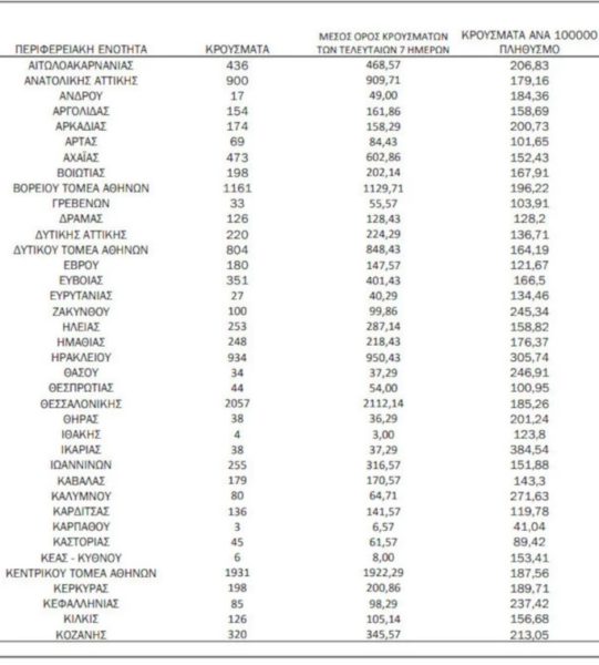 Τα νέα εργαστηριακά επιβεβαιωμένα κρούσματα της νόσου που καταγράφηκαν τις τελευταίες 24 ώρες είναι 19.705 , εκ των οποίων 19 εντοπίστηκαν κατόπιν ελέγχων στις πύλες εισόδου της χώρας. Ο συνολικός αριθμός των κρουσμάτων ανέρχεται σε 2.776.192 (ημερήσια μεταβολή +0.7%), εκ των οποίων 49.3% άνδρες. Με βάση τα επιβεβαιωμένα κρούσματα των τελευταίων 7 ημερών, 189 θεωρούνται σχετιζόμενα με ταξίδι από το εξωτερικό και 1.818 είναι σχετιζόμενα με ήδη γνωστό κρούσμα.