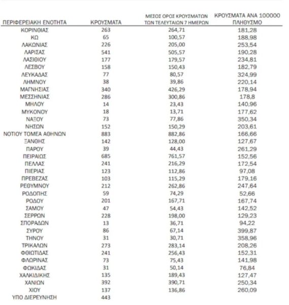 Τα νέα εργαστηριακά επιβεβαιωμένα κρούσματα της νόσου που καταγράφηκαν τις τελευταίες 24 ώρες είναι 19.705 , εκ των οποίων 19 εντοπίστηκαν κατόπιν ελέγχων στις πύλες εισόδου της χώρας. Ο συνολικός αριθμός των κρουσμάτων ανέρχεται σε 2.776.192 (ημερήσια μεταβολή +0.7%), εκ των οποίων 49.3% άνδρες. Με βάση τα επιβεβαιωμένα κρούσματα των τελευταίων 7 ημερών, 189 θεωρούνται σχετιζόμενα με ταξίδι από το εξωτερικό και 1.818 είναι σχετιζόμενα με ήδη γνωστό κρούσμα.