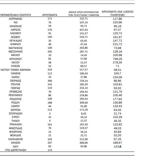 Με βάση τα επιβεβαιωμένα κρούσματα των τελευταίων 7 ημερών, 383 θεωρούνται σχετιζόμενα με ταξίδι από το εξωτερικό και 2.500 είναι σχετιζόμενα με ήδη γνωστό κρούσμα.