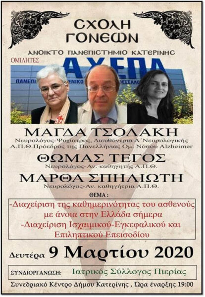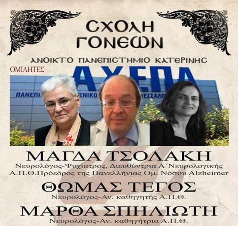 H Νευρολόγος Ψυχίατρος και διευθύντρια της Α΄Νευρολογικής Κλινικής του Α.Π.Θ. κ. Μάγδα Τσολάκη, ο Νευρολόγος και Αναπληρωτής καθηγητής του Α.Π.Θ. κ. Θωμάς Τέγος και η Νευρολόγος Αναπληρώτρια καθηγήτρια του Α.Π.Θ. κ. Μάρθα Σπηλιώτη είναι οι επίσημοι ομιλητές και καλεσμένοι της Σχολής Γονέων – Ανοικτό Πανεπιστήμιο Κατερίνης την Δευτέρα 9 Μαρτίου 2020.