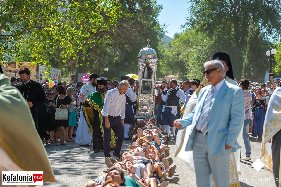 Στη συνέχεια ακολούθησε λιτάνευση του Ιερού σκηνώματος του Αγίου με τους πιστούς να ξαπλώνουν στο οδόστρωμα για να περάσει από πάνω τους το σκήνωμα του Αγίου.