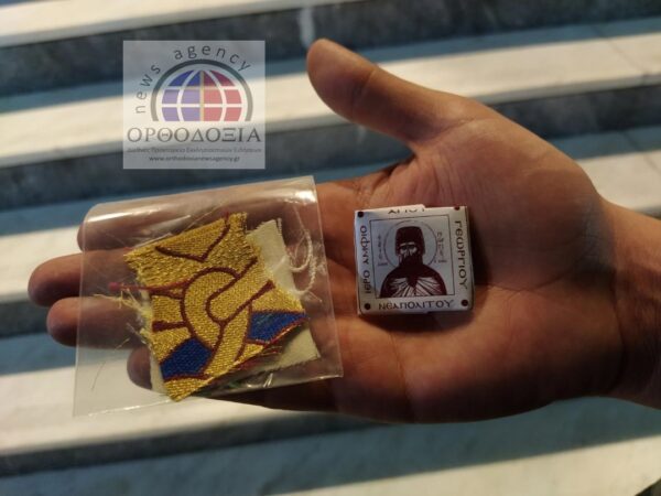Κρατώντας τεμάχια αμφίων του Αγίου Γεωργίου του Νεαπολίτου