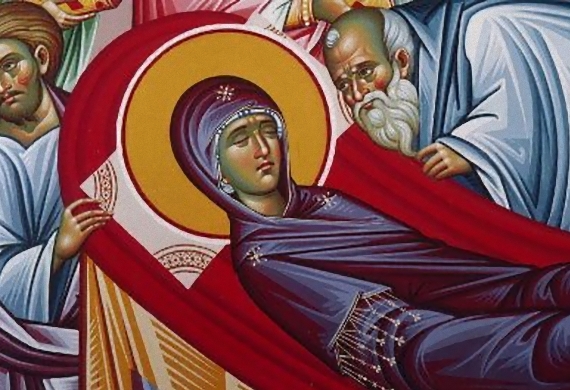 «Καί γενομένης βροντῆς μεγάλης, παρεγένοντο οἱ Ἀπόστολοι πάντες ἐκ τῶν περάτων τῆς γῆς διά νεφελῶν πρός τό κηδεῦσαι τό ἄχραντον αὐτῆς σῶμα. Καί σχηματισθεῖσα ἐπί τῆς κλίνης, παρέθετο τήν ἁγίαν αὐτῆς ψυχήν εἰς χεῖρας τοῦ Υἱοῦ καί Θεοῦ αὐτῆς».