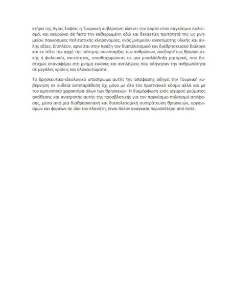 Το θρησκευτικο-ιδεολογικό υπόστρωμα αυτής της απόφασης οδηγεί την Τουρκική κυβέρνηση σε ευθεία αντιπαράθεση όχι μόνο με όλο τον Χριστιανικό κόσμο αλλά και με τον ειρηνοποιό χαρακτήρα όλων των θρησκειών. Η διαμόρφωση ενός ισχυρού ρεύματος αντίθεσης και ανατροπής αυτής της προσβλητικής για τον παγκόσμιο πολιτισμό απόφασης, μέσα από μια διαθρησκειακή και διαπολιτισμική συστράτευση θρησκειών, οργανισμών και φορέων σε όλο τον πλανήτη, είναι πλέον αναγκαία περισσότερο από ποτέ.
