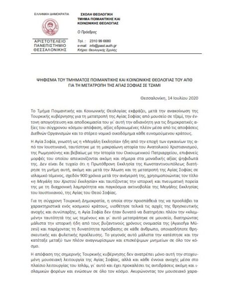 To Tμήμα Ποιμαντικής και Κοινωνικής Θεολογίας εκφράζει, μετά την ανακοίνωση της Τουρκικής κυβέρνησης για τη μετατροπή της Αγίας Σοφίας από μουσείο σε τζαμί, την έντονη απογοήτευση και αποδοκιμασία του γι ̓ αυτή την αδιανόητη για τις δημοκρατικές αξίες του σύγχρονου κόσμου απόφαση, αξίες εδραιωμένες πλέον μέσα από τις αποφάσεις Διεθνών Οργανισμών και το στέρεο νομικό οικοδόμημα κάθε ευνομούμενου κράτους.