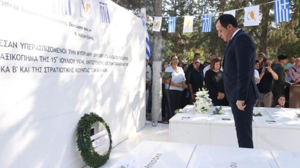 “Έχουμε υποχρέωση να μιλάμε στα παιδιά μας για το τι έγινε τη 15η Ιουλίου” είπε κ. Χριστοδουλίδης σε δηλώσεις του στους δημοσιογράφους, μετά το μνημόσυνο των πεσόντων και πρόσθεσε ότι “τιμούμε τη μνήμη όλων αυτών που αγωνίστηκαν για να υπερασπιστούν ό,τι πιο σημαντικό έχουμε, την Κυπριακή Δημοκρατία”.