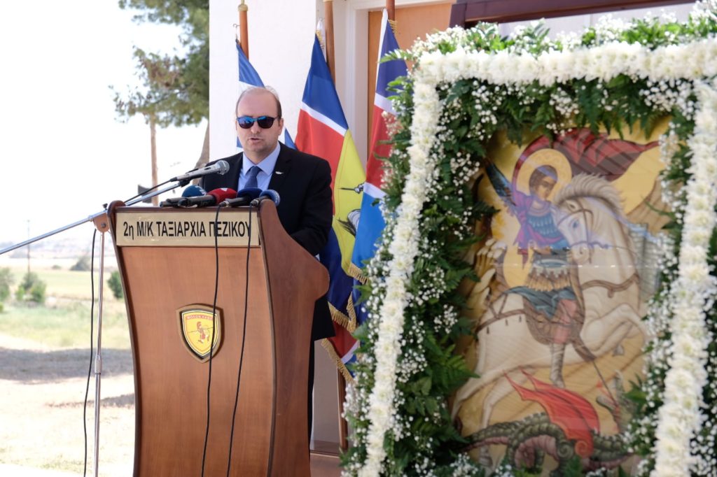 Αναφέρθηκε επίσης, στο αίσθημα δέους και υπερηφάνειας το οποίο νιώθουμε καθώς ατενίζουμε τις πολεμικές σημαίες με την μορφή του Αγίου Γεωργίου, καθώς τις συνδέουμε με τις ηρωικές μάχες που έδωσαν οι ένοπλες δυνάμεις για την υπεράσπιση της πατρίδας μας. Όπως ανέφερε, πρέπει να παραδειγματιζόμαστε από τις Αρετές του Αγίου Γεωργίου αλλά και αυτές που επέδειξαν οι αθάνατοι ήρωες για να διατηρήσουμε την Εθνική Φρουρά ως μια αξιόπιστη δύναμη αποτροπής, ικανή να διασφαλίσει την ειρήνη, προετοιμαζόμενη όμως κάθε μέρα για πόλεμο.