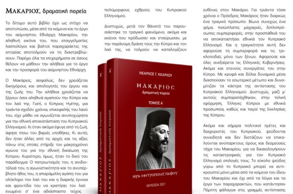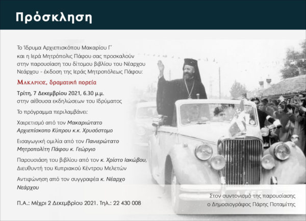 Το Ίδρυμα Αρχιεπισκόπου Μακαρίου Γ΄ παρουσιάζει σε συνεργασία με την Ιερά Μητρόπολη Πάφου το δίτομο έργο του κ. Νέαρχου Νεάρχου “Μακάριος, δραματική πορεία”. Η παρουσίαση του πιο πάνω έργου -έκδοση της Ιεράς Μητροπόλεως Πάφου- θα πραγματοποιηθεί την Τρίτη, 7 Δεκεμβρίου 2021 και ώρα 18:30’ στην Αίθουσα Εκδηλώσεων του Ιδρύματος.