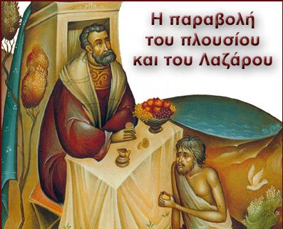 Την εικόνα δύο ανθρώπων διαμετρικά αντίθετων μας παρουσιάζει σήμερα ο Χριστός, μέσα από την παραβολή του ευαγγελίου του Λουκά: ενός πλουσίου, ο οποίος ζούσε στην πολυτέλεια και την καθημερινή απόλαυση, και του φτωχού Λαζάρου, που προσπαθούσε να ξεγελάσει την πείνα του με τα ψίχουλα που έπεφταν από το τραπέζι του πλουσίου. Αλλά και τα αδέσποτα σκυλιά προσέθεταν στην καθημερινή του δυστυχία, καθώς έρχονταν και του έγλειφαν τις πληγές. Κάποτε πέθανε ο φτωχός και άγγελοι τον μετέφεραν στην αγκαλιά του Αβραάμ. Πέθανε και ο πλούσιος και ετάφη. Και από τον Άδη, όπου βασανιζόταν, σήκωσε το βλέμμα του και είδε τον Αβραάμ και στην αγκαλιά του το Λάζαρο. – Ελέησέ με, του λέει, και στείλε το Λάζαρο να βουτήξει το δάχτυλό του στο νερό και να μου δροσίσει τη γλώσσα, γιατί ταλαιπωρούμαι σε τούτη τη φλόγα. – Θυμήσου, του απαντά ο Αβραάμ, ότι όσο ήσουν στη ζωή απόλαυσες κάθε αγαθό, ενώ ο Λάζαρος κάθε κακό. Τώρα αυτός παρηγορείται, ενώ εσύ ταλαιπωρείσαι. Επιπλέον, υπάρχει μεγάλο χάσμα ανάμεσά μας, που καθιστά αδύνατη τη μετάβαση από τη μια πλευρά στην άλλη. – Τότε, σε παρακαλώ, στείλε τον στο πατρικό μου σπίτι, γιατί έχω πέντε αδέλφια. Να τους διηγηθεί όσα συμβαίνουν εδώ, ώστε να μην έλθουν και αυτοί σε τούτο τον τόπο της βασάνου. – Έχουν το Μωυσή και τους προφήτες. Ας ακούσουν εκείνους. – Όχι πατέρα Αβραάμ, δεν αρκεί αυτό. Αλλά αν κάποιος από τους νεκρούς πάει σε αυτούς, θα μετανοήσουν. – Αν δεν ακούν το Μωυσή και τους προφήτες, δεν πρόκειται να πεισθούν ακόμα κι αν κάποιος αναστηθεί από τους νεκρούς.