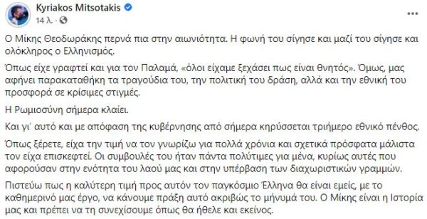 Ο πρωθυπουργός, στο μήνυμά του, αναφερόμενος στην απώλεια του μουσικοσυνθέτη σε ηλικία 96 ετών, υποστήριξε πως «η φωνή του σίγησε και μαζί του σίγησε και ολόκληρος ο Ελληνισμός. Η Ρωμιοσύνη σήμερα κλαίει. Και γι’ αυτό και με απόφαση της κυβέρνησης από σήμερα κηρύσσεται τριήμερο εθνικό πένθος».