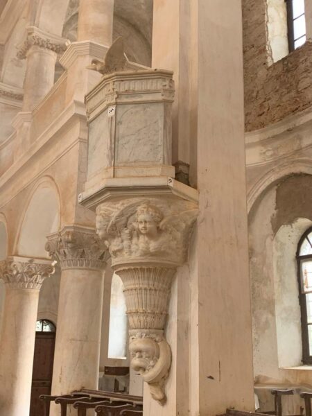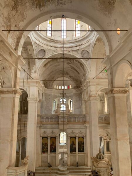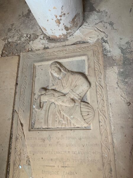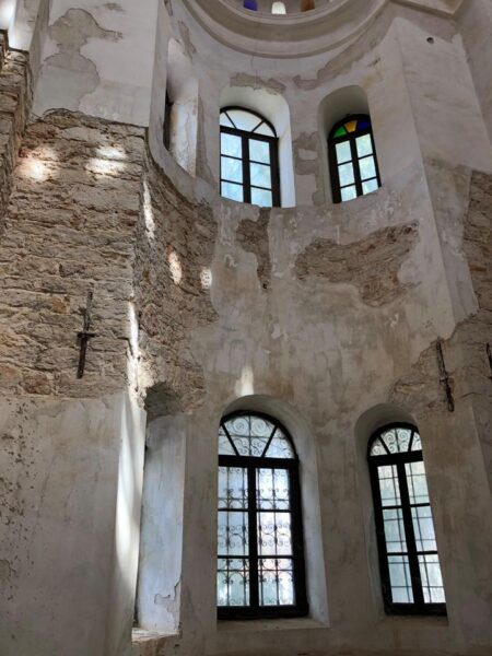 Η κ. Μενδώνη πραγματοποίησε αυτοψία στον Ιερό Ναό του Αγίου Γεωργίου Σαντραπέ, ο οποίος χτίστηκε το 1902 με δωρεά του Αιγυπτιώτη Καστελοριζιού, Λουκά Σαντραπέ και της συζύγου του Αναστασίας, ακολουθώντας ως πρότυπο την εκκλησία της Αγίας Ειρήνης, στην Αθήνα. Ο ναός -έχει χαρακτηριστεί μνημείο από το Υπουργείο Πολιτισμού και Αθλητισμού- εγγεγραμμένος σταυροειδής, εκλεκτικιστικού ρυθμού, έμεινε ημιτελής έπειτα από τον θάνατο του δωρητή και του αρχιτέκτονα. Οι προσπάθειες αποκατάστασής του, κατά τη δεκαετία του ΄80, δεν ολοκληρώθηκαν.