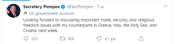 «Ανυπομονώ να συζητήσω σημαντικά θέματα εμπορίου, ασφάλειας και θρησκευτικής ελευθερίας με τους ομολόγους μου στην Ελλάδα, την Ιταλία, την Αγία Έδρα και την Κροατία την επόμενη εβδομάδα».