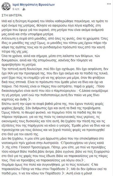 Κείμενο αφιερώνει ο Μητροπολίτης Βρυούλων κ. Παντελεήμων στην αυριανή Γιορτή της Μητέρας, όπου, καθώς χαρακτηριστικά διηγείται: “Δεν θα ξεχάσω, τι μου είπε μια άρρωστη μάνα που την επισκέφθηκα στο νοσοκομείο πρίν χρόνια στην Αυστραλία. Προσευχήσου να γίνεις καλά, τής είπα. Γέλασε! Προσεύχομαι, Πάτερ, μου είπε, μα πού να προλάβεις τόσο κόσμο! Βάλε παιδιά,βάλε άντρα, βάλε εγγόνια, βάλε να πείς Ευχαριστώ στο Θεό για τις χαρές που τους έδωσε.Βάλε να παρακαλέσεις για τις πίκρες τους. Πού να προλάβεις να παρακαλέσεις για λόγου σου; Θυμάμαι όμως πιο πολύ και συγκινήθηκα, με το πώς τελείωσε: Να παρακαλέσω Πάτερ να πάω στον Παράδεισο; Μά άν δεν έρθουν εκεί τα παιδιά μου, τι να τον κάνω τον Παράδεισο; Αυτή είναι η μάνα!”.