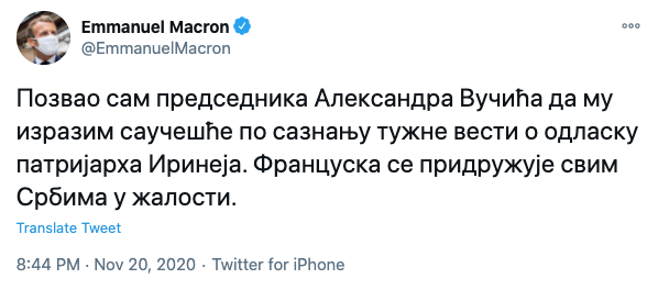 “Επικοινώνησα με τον Πρόεδρο Αλεξάνταρ Βούτσιτς για να εκφράσω τα συλλυπητήρια μου αφότου πληροφορήθηκα την θλιβερή είδηση της κοίμησης του Πατριάρχου Ειρηναίου. Η Γαλλία πενθεί μαζί με όλους τους Σέρβους.”, αναφέρει το μήνυμα του Γάλλου Προέδρου σε μέσο κοινωνικής δικτύωσης.