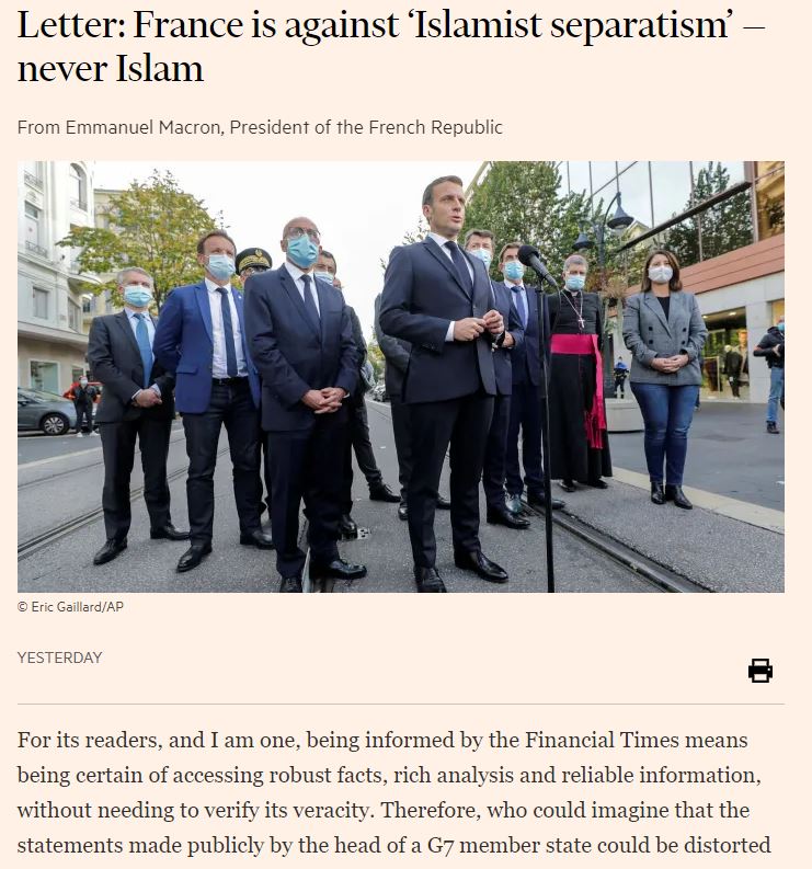 Ο Γάλλος πρόεδρος Εμανουέλ Μακρόν δημοσίευσε χθες, Τετάρτη, το βράδυ ένα άρθρο στους Financial Times προκειμένου να εξηγήσει ότι “ η Γαλλία μάχεται εναντίον του ισλαμιστικού αυτονομισμού, ποτέ εναντίον του ισλάμ”, σε απάντηση σε άρθρο που δημοσιεύθηκε στον ιστότοπο της βρετανικής εφημερίδας τη Δευτέρα, το οποίο όμως πλέον έχει αποσυρθεί.