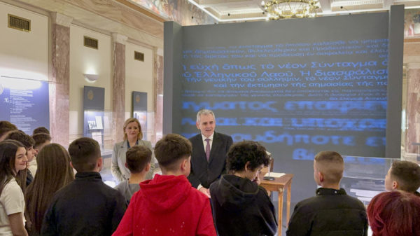 «Το Σύνταγμα είναι ο θεμελιώδης νόμος του κράτους, που ορίζει τους βασικούς κανόνες της λειτουργίας του πολιτεύματος. Όλοι οφείλουμε να σεβόμαστε όσα ορίζονται στα άρθρα του Συντάγματος. Γιατί, μόνον έτσι μπορεί μια κοινωνία να αναπτύσσεται ειρηνικά και δημιουργικά. Ως εκ τούτου κι εσείς, ως αυριανοί πολίτες, είναι εξαιρετικά ωφέλιμο να λάβετε βασικές γνώσεις του Συντάγματός μας. Ιδιαίτερα μάλιστα αυτό το διάστημα, που η Βουλή ξεκινά τη διαδικασία για την αναθεώρηση διατάξεων που πρέπει να εκσυγχρονιστούν, η επίσκεψή σας στην έκθεση του Κοινοβουλίου για τα 50 χρόνια από την ψήφιση του Συντάγματος θα σας βοηθήσει να κατανοήσετε καλύτερα αυτά που περιγράφονται στον καταστατικό μας χάρτη», τόνισε ο κ. Μάξιμος Χαρακόπουλος καλωσορίζοντας τις μαθήτριες και τους μαθητές.