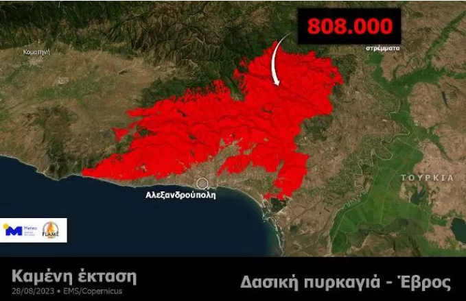 Συνολικά έχουν καεί πάνω από 800.000 στρέμματα στον Έβρο σύμφωνα με την υπηρεσία Ταχείας Χαρτογράφησης Copernicus της Ευρωπαϊκής Επιτροπής.