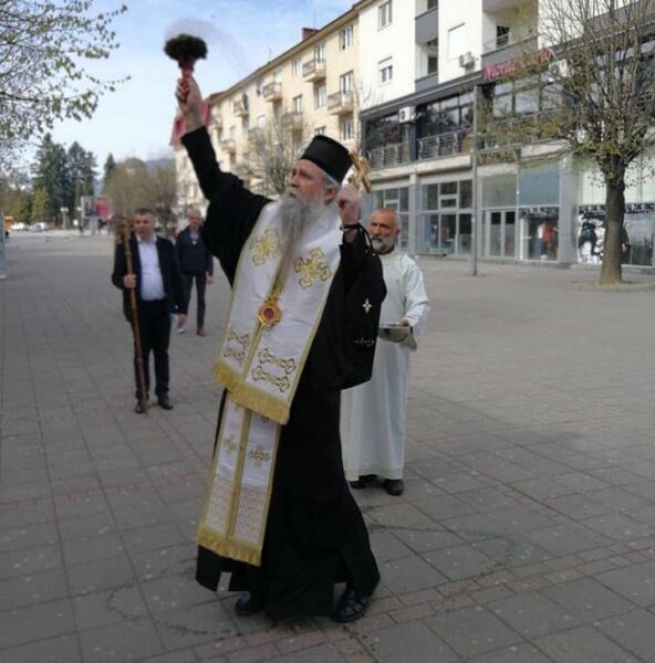 Ο Επίσκοπος Μπουντίμλιε και Νίκσιτς, σήμερα το πρωί, με τους ιερείς ράντιζε με το αγιασμό τους δρόμους της πόλεως Μπέρανε (Βόρειο Μαυροβούνιο, έδρα της Επισκοπής) δεόμενος υπέρ της ειρήνης και υγείας όλων των πολιτών.