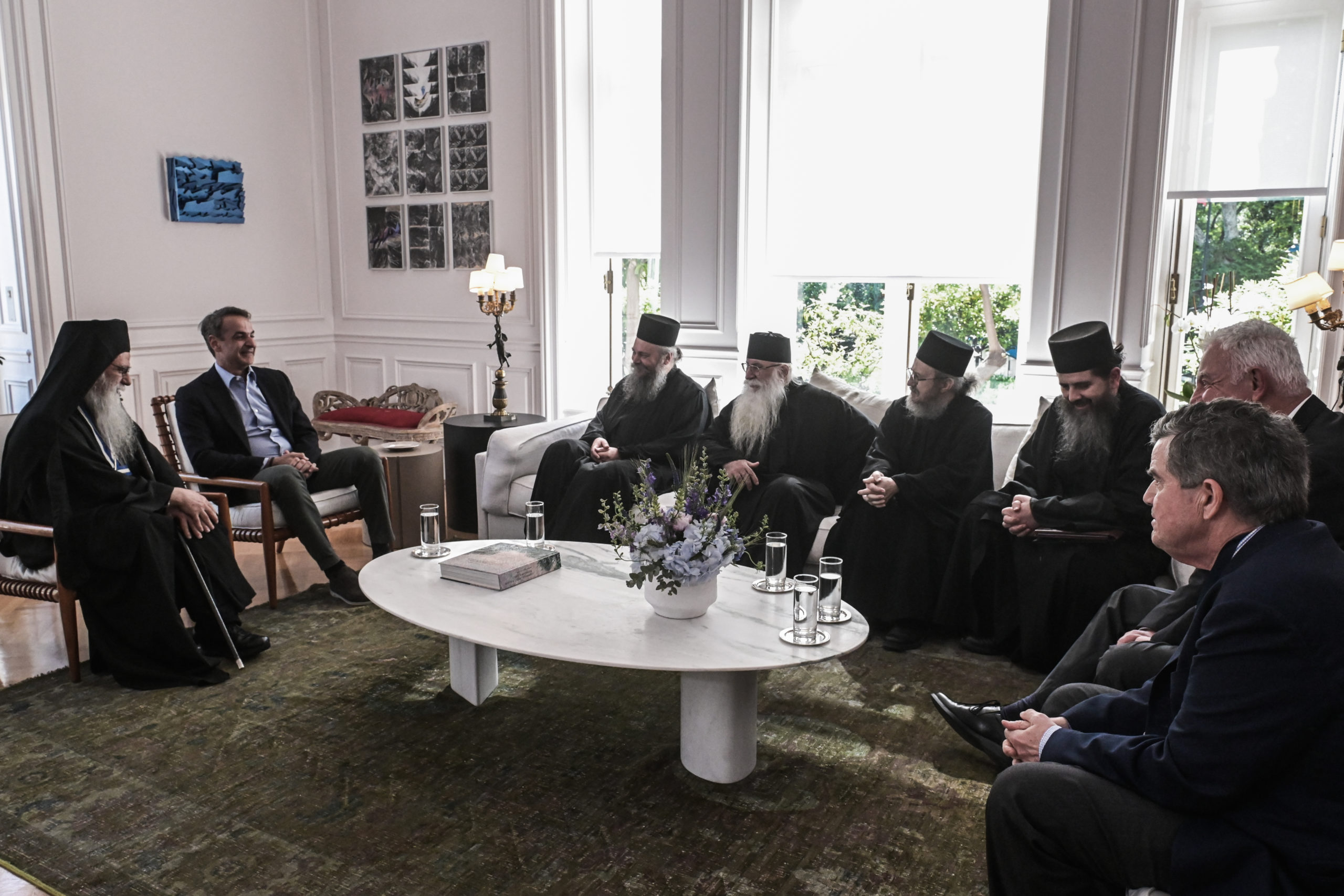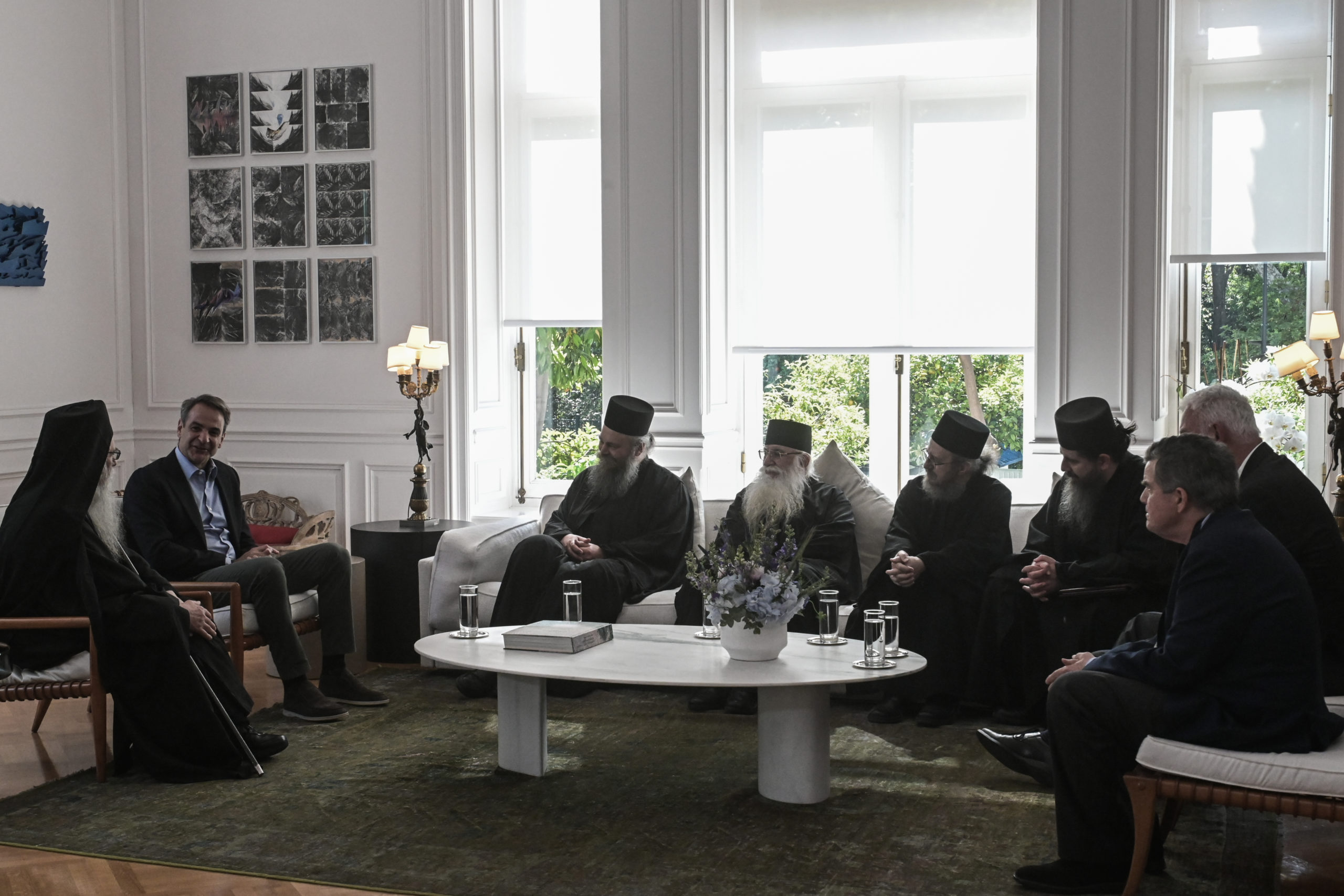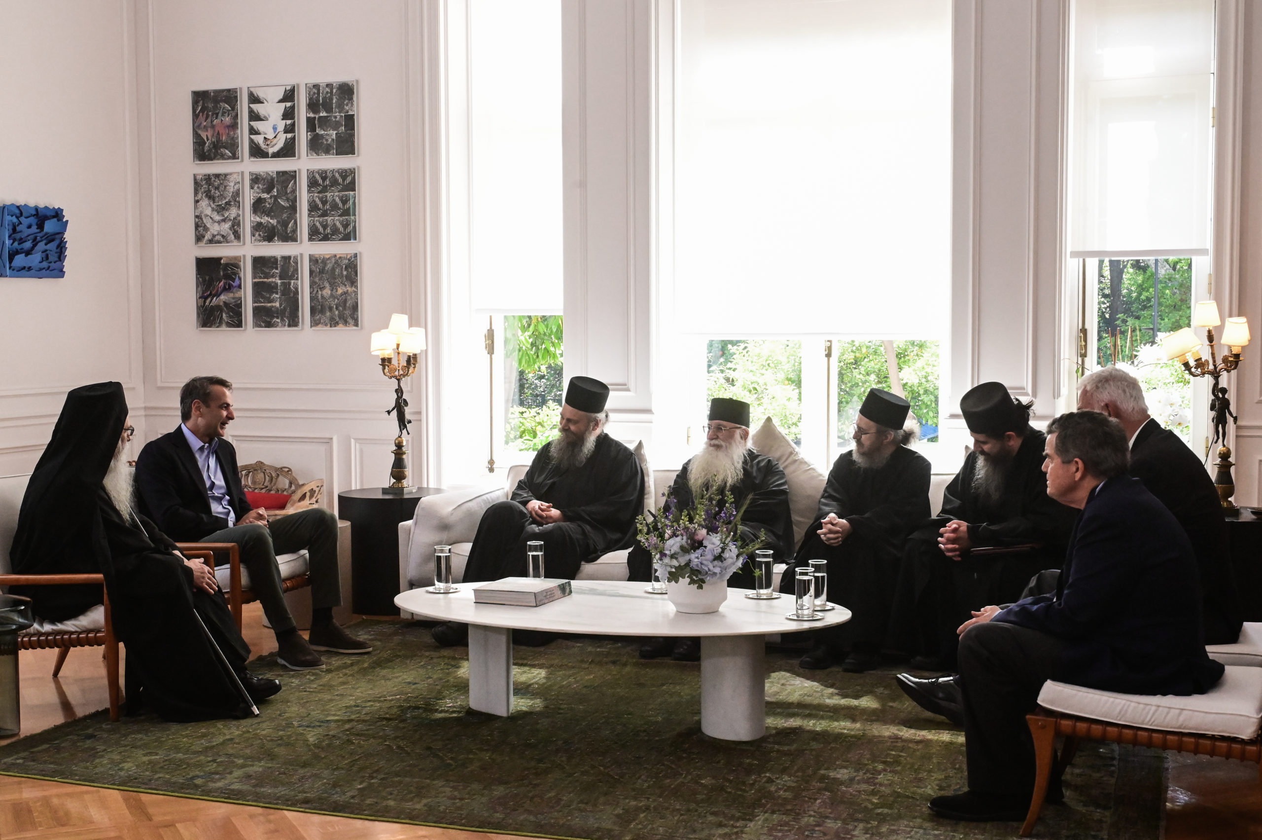 Συνάντηση του Πρωθυπουργού Κυριάκου Μητσοτάκη με εκπροσώπους της Ιεράς Κοινότητας του Αγίου Όρους στο Μέγαρο Μαξίμου, Τετάρτη 3 Μαΐου 2023.