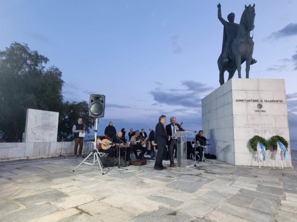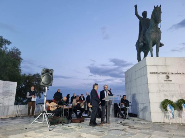 Ο Δήμαρχος στην ομιλία του τόνισε ότι «με τον ηρωικό θάνατό του, ο τελευταίος Αυτοκράτορας Κωνσταντίνος ΙΑ’ Παλαιολόγος, θεμελίωσε την ύπαρξη και την παρουσία του Ελληνισμού στο διηνεκές και δημιούργησε όλες εκείνες τις συνθήκες, ώστε ο Ελληνισμός να κάνει την ιστορική του επανεμφάνιση με την Παλιγγενεσία του 1821 μετά από τέσσερις αιώνες σκλαβιάς», ενώ σημείωσε ότι «η σεμνή τελετή, η οποία τα τελευταία χρόνια διοργανώνεται πάντα τέτοια μέρα από την Δημοτική Αρχή, φιλοδοξεί να υπενθυμίζει σε όλους μας και κυρίως στην νεολαία μας, τις θυσίες, την παράδοση και την ιστορία του Ελληνισμού της Πόλης που επιβίωσε στο διηνεκές, στάθηκε στα πόδια του κάτω από εξαιρετικά αντίξοες συνθήκες και κατάφερε να μεγαλουργήσει».
