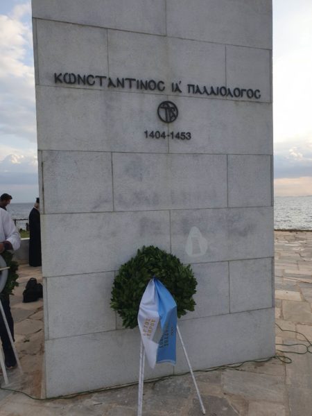 Την εκδήλωση τίμησε όπως κάθε χρόνο με την παρουσία και τον χαιρετισμό του, ο Πρόεδρος της Οικουμενικής Ομοσπονδίας Κωνσταντινουπολιτών – ΟΙΟΜΚΩ Ομότιμος Καθηγητής Νικόλαος Ουζούνογλου, ο οποίος στην ομιλία του αναφέρθηκε σε ιστορικές λεπτομέρειες του σημαντικού ιστορικού για τον Ελληνισμό γεγονότος και τόνισε ιδιαίτερα την αξία και τη σημασία του αγώνα της πρώην Δημοτικής Αρχής του Διονύση Χατζηδάκη, νυν βουλευτού Νοτίου Τομέα Β3 Αθήνας, για την τοποθέτηση του ανδριάντα του Κωνσταντίνου ΙΑ΄ Παλαιολόγου στο συγκεκριμένο σημείο.