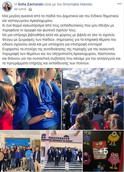 “Μια μεγάλη αγκαλιά από τα παιδιά του Δημοτικού και του Ειδικού δημοτικού και νηπιαγωγείου Αρκαλοχωρίου. Κι ένα θερμό καλωσόρισμα από τους εκπαιδευτικούς που μου έδειξαν με περηφάνια το όμορφο και φωτεινό σχολείο τους. Με μια υπέροχη βιβλιοθήκη αλλά και χώρους με βιβλία σε όλο το σχολείο. Φεύγω με ζωγραφιές των παιδιών, σημειώσεις για τα κτηριακά θέματα του ειδικού σχολείου αλλά και μια υπόσχεση για επιστροφή σύντομα! Ευχαριστώ τα στελέχη της αυτοδιοίκησης της περιοχής για την αναλυτική περιγραφή των θεμάτων και τον Μητροπολίτη Αρκαλοχωρίου, Καστελλίου και Βιάννου για την ουσιαστική συζήτηση που κάναμε για την αλληλεγγύη και τα προγράμματα στήριξης και εκπαίδευσης των πολιτών” αναφέρει σε ανάρτηση της στο Facebook.
