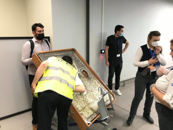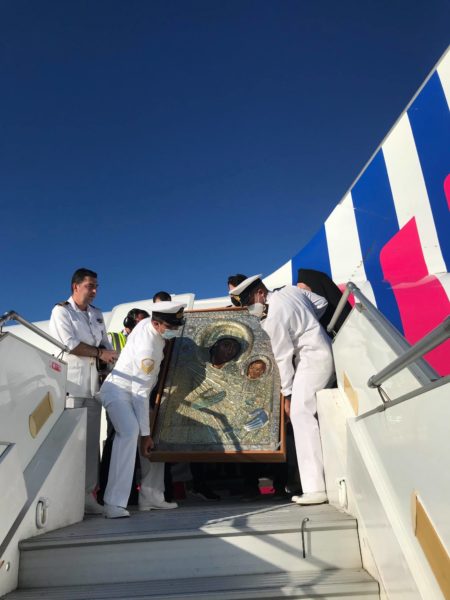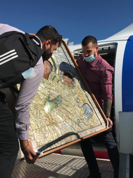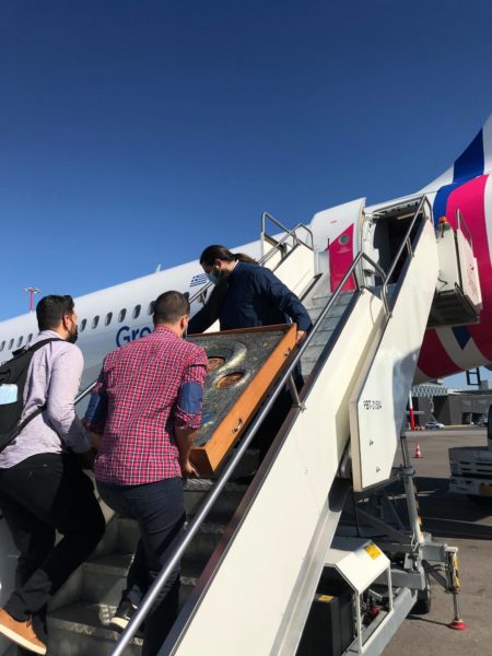 Τοποθετήθηκε στην καμπίνα επιβατών του αεροσκάφους, συνοδεία του π. Αμβροσίου Ματσά και μελών του Εκκλησιαστικού Συμβουλίου του Ιερού Ναού.
