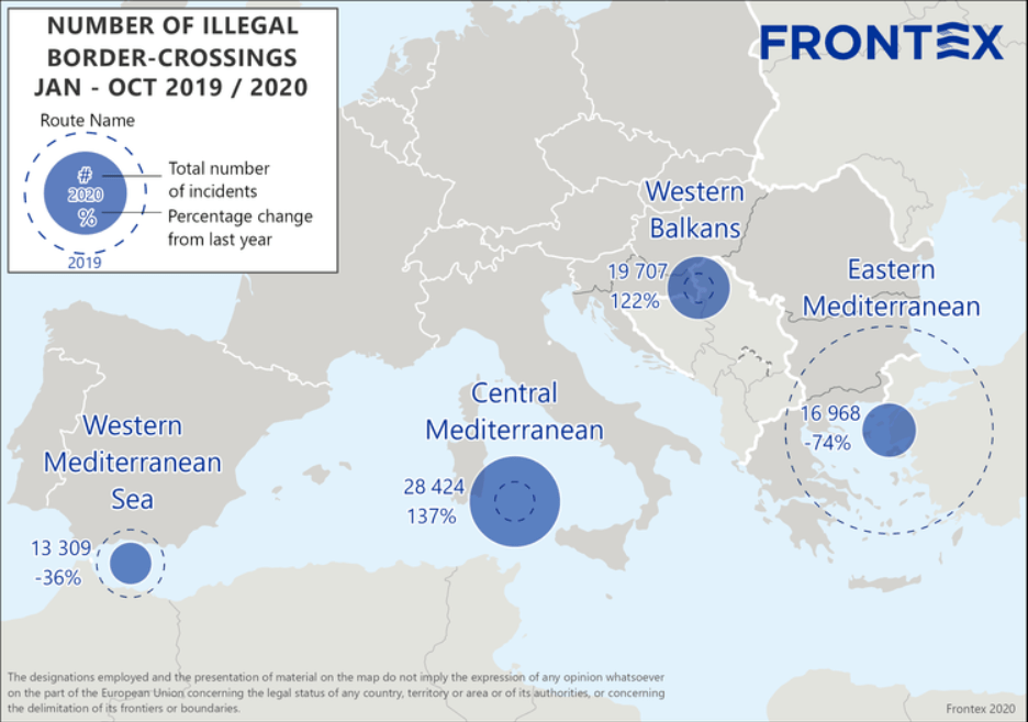 Μόνο τον Οκτώβριο καταγράφηκαν περίπου 1.050 διελεύσεις και η αντίστοιχη μείωση συγκριτικά με τον Σεπτέμβριο ανέρχεται στο 25%. Μάλιστα, οι περισσότερες από αυτές έγιναν στο έδαφος και όχι στη θάλασσα και προέρχονται από το Αφγανιστάν, τη Συρία και την Τουρκία, και καταγράφονται στις πύλες της Ανατολικής Μεσογείου – μεταξύ των οποίων ασφαλώς και η Ελλάδα.