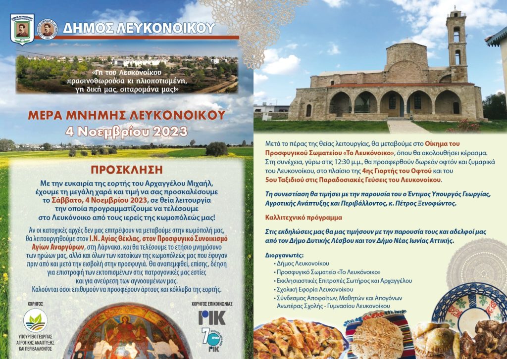 Μετά το πέρας της Θείας Λειτουργίας, στο Οίκημα του Προσφυγικού Σωματείου «Το Λευκόνοικο» θα ακολουθήσει κέρασμα. Στη συνέχεια, γύρω στις 12:30μμ, θα προσφερθούν δωρεάν οφτόν και ζυμαρικά του Λευκονοίκου, στο πλαίσιο της 4ης Γιορτής του Οφτού και του 5ου Ταξιδιού στις Παραδοσιακές Γεύσεις του Λευκονοίκου.