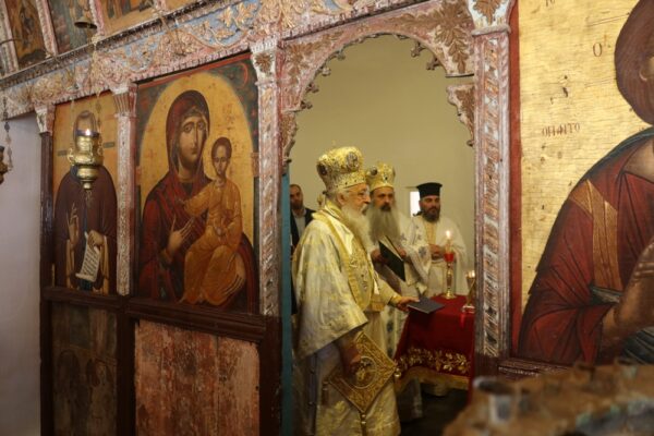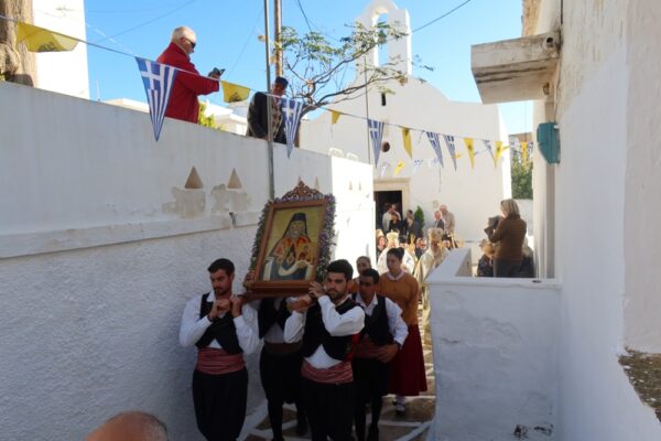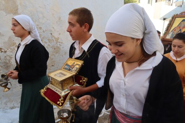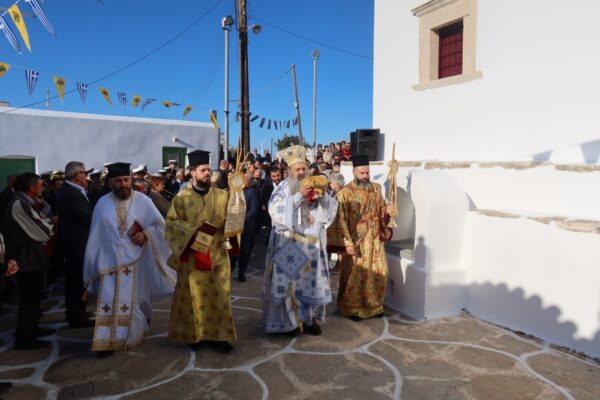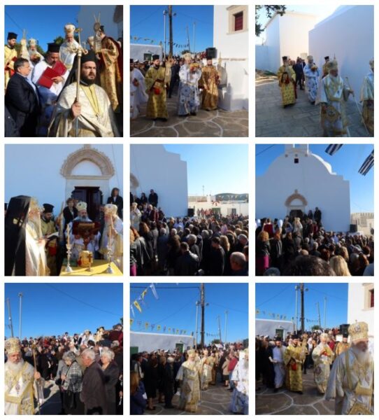 ΚΥΘΝΟΣ – Αμεσως μετά το πέρας της Ακολουθίας του Όρθρου, που τελέσθηκε στον Ιερό Ναό του Αγίου Σάββα στη Χώρα της Κύθνου, η ιερά Εικόνα και τα τίμια Λείψανα του Αγίου Ιγνατίου, Μητροπολίτου Μαριουπόλεως, του Κυθνίου, φερόμενα υπό Νέων και Νεανίδων του Πολιτιστικού Συλλόγου Χώρας, ενδεδυμένων με παραδοσιακές ενδυμασίες, και, επί Δισκαρίου, τίμια λείψανα των εν τη Ιερά Μονή του Οσίου Θεοδοσίου του Κοινοβιάρχου αναιρεθέντων Πατέρων, μεταφέρθηκαν λιτανευτικώς και με κάθε Εκκλησιαστική τάξη, μέσα από τα πεντακάθαρα γραφικά δρομάκια της Χώρας, τα οποία οι ευσεβείς Χωραΐτισσες είχαν επιστρώσει με τάπητες και άνθη, προς τον Ιερό Ναό της Μεταμορφώσεως του Σωτήρος, κτίσματος του 16ου αιώνος, ο οποίος ανεκαινίσθη με την πρόφρονα και φιλάγιο χορηγία του φιλογενούς και φιλεντόλου ζεύγους των Μεγάλων Ευεργετών της Εκκλησίας και του Γένους Μαρίνας και Αθανασίου Μαρτίνου, το καλλιτεχνικώτατο τέμπλο του οποίου συντηρήθηκε με δαπάνη του «Συνδέσμου Κυθνίων», από τις Υπηρεσίες της Εφορείας Βυζαντινών Αρχαιοτήτων Κυκλάδων.