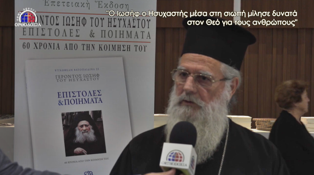“Πρόκειται για μια μεγάλη ησυχαστική μορφή που μέσα στην ησυχία έζησε την ένταση της κοινωνίας μας και μέσα στη σιωπή μπόρεσε να μιλήσει πολύ δυνατά στον Θεό για όλους τους ανθρώπους. Να έχουμε την ευχή του και η Εκκλησία μας να αναδεικνύει πάντα τέτοιους ανθρώπους που θα μας εμπνέουν με την ασκητική τους ζωή” ανέφερε χαρακτηριστικά και μεταξύ άλλων σε αποκλειστική του δήλωση ο Σεβασμιώτατος Μητροπολίτης πρώην Άρτης κ. Ιγνάτιος στο Πρακτορείο “Ορθοδοξία” στο πλαίσιο της Μεγάλης χθεσινής εκδήλωσης για μία σπουδαία προσωπικότητα της Ορθοδοξίας, τον Γέροντας Ιωσήφ τον Ησυχαστή.