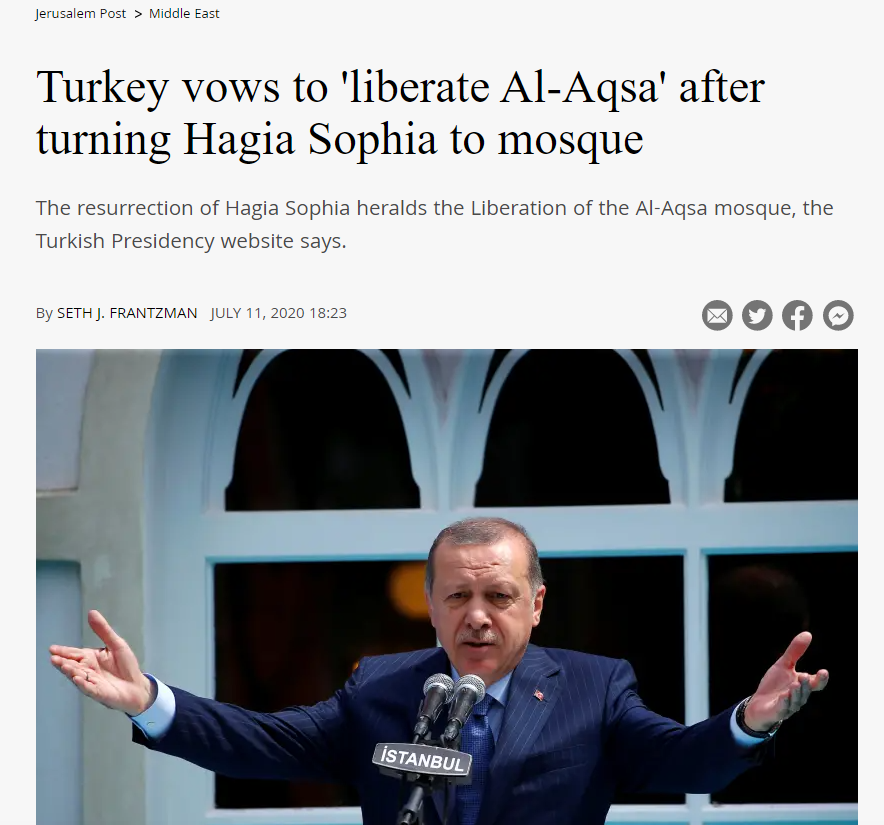 Η τουρκική προεδρία σε ανακοίνωσή της αναφέρει ότι μετά την «ανάσταση» της Αγίας Σοφίας, σειρά έχει η απελευθέρωση του τζαμιού Al-Aqsa στην Ιερουσαλήμ.