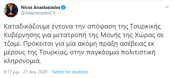 Την καταδίκη του για την μετατροπή της Μονής της Χώρας σε τζαμί εκφράζει ο Πρόεδρος της Κυπριακής Δημοκρατίας Νίκος Αναστασιάδης. Με ανάρτησή του στον επίσημο λογαριασμό του στο twitter, ο Ν. Αναστασιάδης αναφέρει: