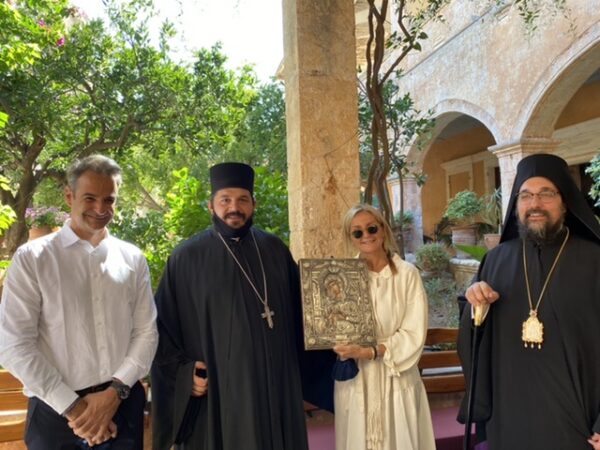 Πριν την αναχώρηση του Πρωθυπουργού, ο Θεοφιλέστατος προσέφερε στην σύζυγο του Πρωθυπουργού κ. Μαρέβα Μητσοτάκη, για την εορτή της, μια εικόνα της Παναγίας.