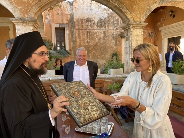 Πριν την αναχώρηση του Πρωθυπουργού, ο Θεοφιλέστατος προσέφερε στην σύζυγο του Πρωθυπουργού κ. Μαρέβα Μητσοτάκη, για την εορτή της, μια εικόνα της Παναγίας.