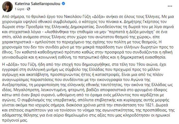 «Με μεγάλη χαρά και συγκίνηση υποδεχόμαστε σήμερα στο Προεδρικό Μέγαρο τον πίνακα του Νικολάου Γύζη «Δόξα», δωρεά του ως σήμερα κατόχου του έργου, κ. Δημήτρη Γκέρτσου. Με μια χειρονομία ευγενούς προσφοράς και υψηλού εθνικού συμβολισμού ο κ. Δημήτρης Γκέρτσος αποχωρίστηκε ένα πολύτιμο οικογενειακό κειμήλιο με τη σκέψη, όπως ο ίδιος χαρακτηριστικά αναφέρει, ότι ένας πίνακας με τόσο «μεγάλη εθνική διάσταση και αναγνώριση δεν μπορούσε να του ανήκει». Η «Δόξα» είναι μια από τις πλέον αναγνωρίσιμες παραστάσεις που συνδέονται με την εικονογραφία του Αγώνα της Ανεξαρτησίας και έχει ταυτιστεί με την εικόνα της Ελλάδας. Μιας Ελλάδας ηρωικής που αγωνίζεται και δεν πτοείται στη δυσκολία, αναγεννάται και πορεύεται στην Ιστορία ελεύθερη και περήφανη. Η δωρεά της «Δόξας» είναι μια προσφορά στο κοινωνικό σύνολο. Ενδυναμώνει τη σχέση του πολίτη με τους θεσμούς, συνδέει τον ιδιωτικό χώρο με τη δημόσια σφαίρα και υπογραμμίζει τον ρόλο που μπορεί να παίξει η υψηλή τέχνη στην αυτογνωσία μας».