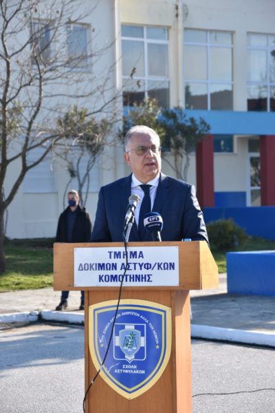 Οφείλουν όλα τα μέλη της ακαδημαϊκης κοινότητας να συμβάλλουν σε αυτή την προσπάθεια, χωρίς φόβο και δισταγμό. Πράγματα αυτονόητα σε ολόκληρο τον κόσμο. Εμείς, ως Υπουργείο Προστασίας του Πολίτη, ως ΕΛ.ΑΣ. κάνουμε όλα όσα πρέπει για αυτόν τον σκοπό με σχέδιο και αποφασιστικότητα. Σας εύχομαι καλή παραμονή, να ανταποκριθείτε όλοι στην εκπαίδευσή σας, να έχετε εξαιρετική σταδιοδρομία και να γνωρίζετε ότι θα είμαστε δίπλα σας σε κάθε στιγμή που θα αισθανθείτε ότι χρειάζεστε τη στήριξη της Πολιτείας.»
