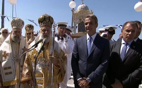 Νωρίτερα ο Πρωθυπουργός έριξε στεφάνι στον υγρό τάφο του καταδρομικού «’Ελλη» που βυθίστηκε στις 15 Αυγούστου του 1940, ανήμερα της Γιορτής της Παναγίας.