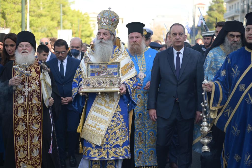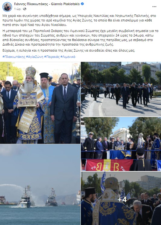 «Με χαρά και συγκίνηση υποδέχθηκα σήμερα, ως Υπουργός Ναυτιλίας και Νησιωτικής Πολιτικής, στο πρώτο λιμάνι της χώρας το ιερό κειμήλιο της Αγίας Ζώνης, το οποίο θα είναι επισκέψιμο για κάθε πιστό στον Ιερό Ναό του Αγίου Νικολάου.