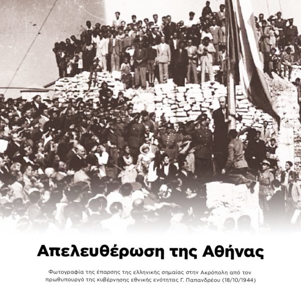 78 χρόνια από την Απελευθέρωση της Αθήνας (12/10/1944). «Και βλέπομε τη γερμανική σημαία σιγά-σιγά να υποστέλλεται, να εξαφανίζεται, σαν να την κατάπιε ο Ιερός Βράχος. Και ν’ αρχίζη ν’ ανεβαίνη στον ιστό το αγαπημένο χρώμα του ουρανού μας» (Ιωάννα Τσάτσου, Φύλλα Κατοχής)“, όπως έγραψε χαρακτηριστικά ο κ. Δένδιας.