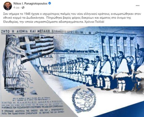 «Σαν σήμερα το 1948 ήχησε ο ισχυρότερος παλμός του νέου ελληνικού κράτους, ενσωματώθηκαν στον εθνικό κορμό τα Δωδεκάνησα. Πληρώθηκε βαρύς φόρος δακρύων και αίματος στο όνομα της Ελευθερίας, την οποία υπερασπιζόμαστε αδιαπραγμάτευτα. Χρόνια Πολλά!», αναφέρεται στο μήνυμα του Νίκου Παναγιωτόπουλου σε μέσο κοινωνικής δικτύωσης.