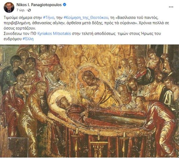 «Τιμούμε σήμερα στην Τήνο την Κοίμηση της Θεοτόκου, τη «Βασίλισσα τοῦ παντός, περιβεβλημένη, ἀθανασίας αἴγλην, ἀρθεῖσα μετὰ δόξης, πρὸς τὰ οὐράνια». Χρόνια πολλά σε όσους εορτάζουν», έγραψε στον προσωπικό λογαριασμό του σε μέσο κοινωνικής δικτύωσης ο υπουργός Εθνικής Άμυνας Νικόλαος Παναγιωτόπουλος με την ευκαιρία της σημερινής μεγάλης εορτής της Ορθοδοξίας