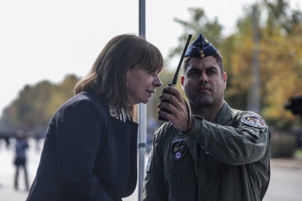 Η κ. Σακελλαροπούλου συνομίλησε με τον κυβερνήτη του μαχητικού F-16 της ομάδας αεροπορικών επιδείξεων «ΖΕΥΣ», επισμηναγό Χριστόδουλο Γιακουμή, με πάνω από 1.600 ώρες πτήσης, την ώρα που έκανε θεαματικές διελεύσεις και επικίνδυνους ελιγμούς πάνω από τον χώρο της παρέλασης, στη λεωφόρο Μεγάλου Αλεξάνδρου, κόβοντας την ανάσα των πολιτών που παρακολουθούσαν, και ο διάλογός τους ακούστηκε από τα ηχεία.