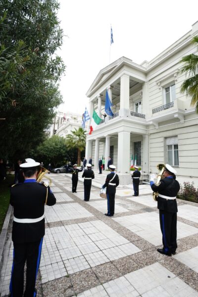 “Λάβαμε σήμερα την πρωτοβουλία, από κοινού με τον κ. Πρόεδρο της Βουλής των Ελλήνων, να πραγματοποιήσουμε μία λιτή, σεμνή τελετή που περιελάμβανε την έπαρση των δύο σημαιών και την ανάκρουση των εθνικών ύμνων, της Ελλάδος και της Ιταλίας, σε μία έκφραση αγάπης, συμπαράστασης και αλληλεγγύης προς τον ιταλικό λαό. Έναν λαό στενό φίλο της Ελλάδας και ο οποίος δοκιμάζεται όσο κανείς άλλος σήμερα από την πανδημία του κορωνοϊού”, ανέφερε στον χαιρετισμό του ο υπουργός Εξωτερικών Νίκος Δένδιας, ο οποίος έστειλε μήνυμα αισιοδοξίας προς τον φίλο ιταλικό λαό αναφέροντας πως: “καταβάλλουμε κάθε προσπάθεια για την έμπρακτη συνδρομή μας προς την Ιταλία σ’ αυτήν τη δραματική για όλους μας κατάσταση”.