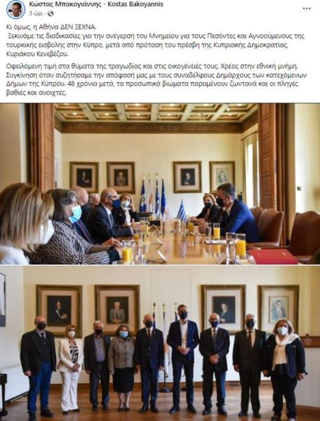 «Κι όμως, η Αθήνα ΔΕΝ ΞΕΧΝΑ. Ξεκινάμε τις διαδικασίες για την ανέγερση του Μνημείου για τους Πεσόντες και Αγνοούμενους της τουρκικής εισβολής στην Κύπρο, μετά από πρόταση του πρέσβη της Κυπριακής Δημοκρατίας, Κυριάκου Κενεβέζου. Οφειλόμενη τιμή στα θύματα της τραγωδίας και στις οικογένειές τους. Χρέος στην εθνική μνήμη. Συγκίνηση όταν συζητήσαμε την απόφασή μας με τους συναδέλφους Δημάρχους των κατεχόμενων Δήμων της Κύπρου. 48 χρόνια μετά, τα προσωπικά βιώματα παραμένουν ζωντανά και οι πληγές βαθιές και ανοιχτές.», αναφέρει στο μήνυμα του ο Δήμαρχος Αθηναίων.
