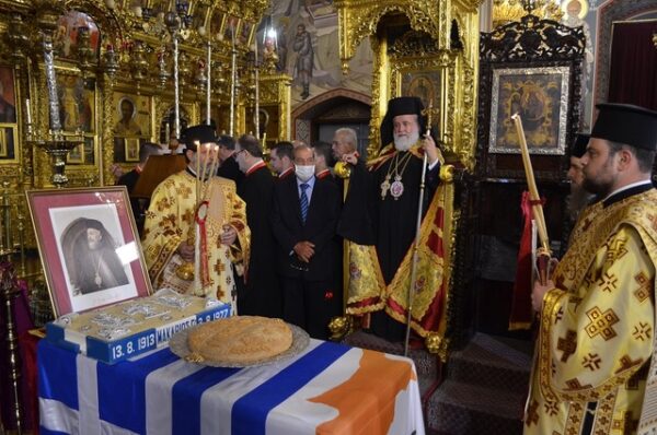 Το επίσημο θρησκευτικό μνημόσυνό του τελέστηκε, προεξάρχοντος του Πανιερωτάτου Μητροπολίτη Κύκκου και Τηλλυρίας κ. Νικηφόρου, στην ιστορική Ιερά Βασιλική και Σταυροπηγιακή Μονή της Ελεούσας του Κύκκου, τη Μονή, η οποία μπορεί να καυχάται εν Κυρίω ότι στους κόλπους της γαλουχήθηκε και αναπτύχθηκε πνευματικά ο Μεγάλος αυτός Ηγέτης, αλλά και ότι στις αγκάλες της επέλεξε να αναπαύεται, από τις 3 Αυγούστου 1977, το περικαλλές τούτο τέκνο της.