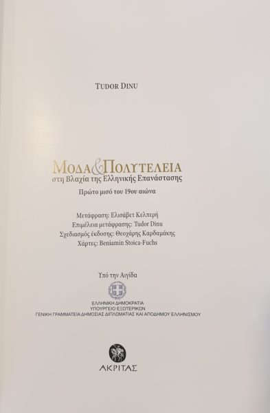 Η Γενική Γραμματεία Διπλωματίας και Απόδημου Ελληνισμού ξέδωσε  υπό την αιγίδα της πολυτελή επετειακό τόμο.  Ο Γενικός Γραμματέας κ. Γιάννης Χρυσουλάκης τόνισε: “Χορηγήσαμε αιγίδα σε μία πολύ σημαντική έρευνα και έκδοση: Mόδα και Πολυτέλεια στη Βλαχία της Ελληνικής Επανάστασης».