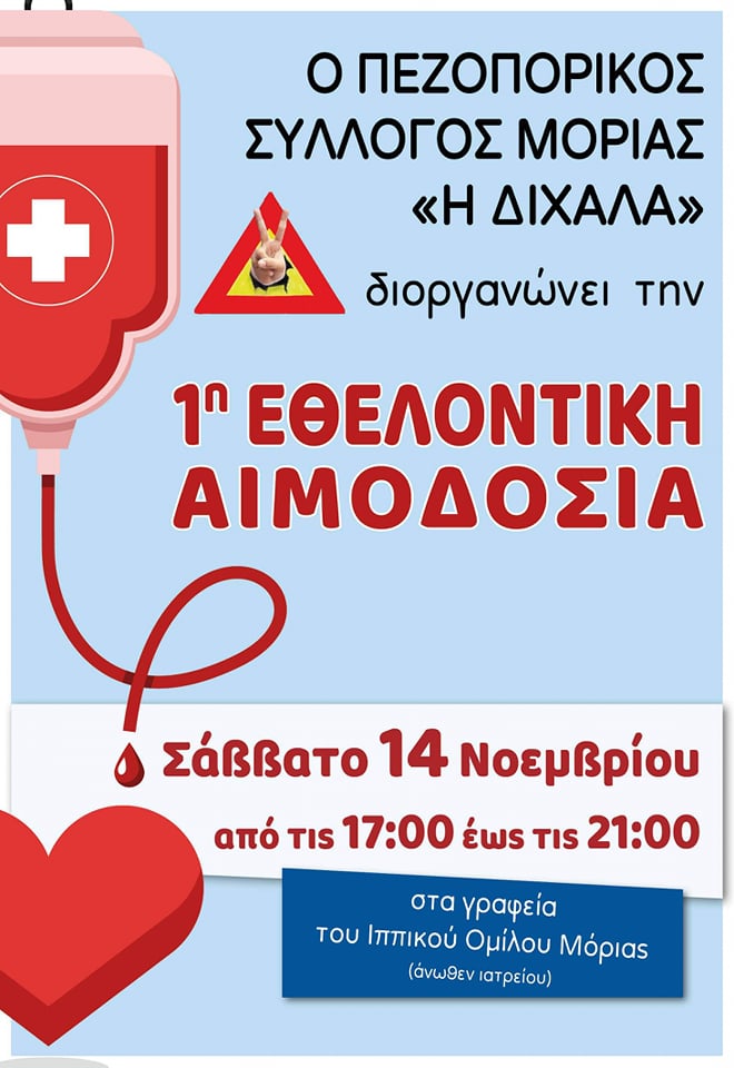 Αξίζει να σημειωθεί τέλος, ότι ο πεζοπορικός σύλλογος Μόριας “Η Διχάλα” διοργανώνει την πρώτη εθελοντική αιμοδοσία του, το Σάββατο 14 Νοεμβρίου.